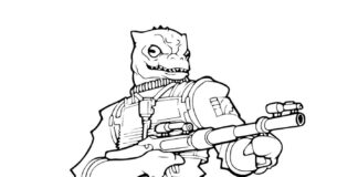 Ta postać ze Star Wars to Bossk. Ma postawę człowieka, ale wyglądem przypomina zwierzę. Bohater wyposażony jest w karabin,...