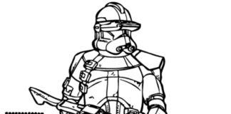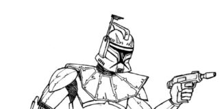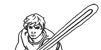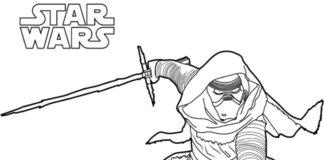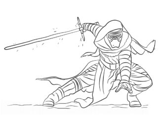 A tutaj mamy wojownika Kylo Ren z mieczem. Bohater przyjął pozycję gotowości do walki. Pokoloruj ilustrację kredkami. Pamiętaj aby nie wyjść kredką poza kontury...