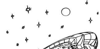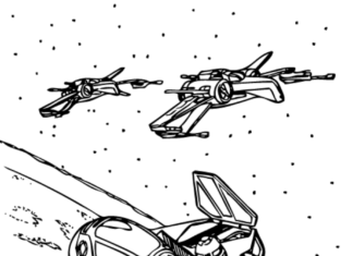 Przed tobą scena z filmu Gwiezdne Wojny. Jeśli jesteś fanem tego filmu na pewno rozpoznasz statki kosmiczne na rysunku. Pokoloruj ilustrację. Zwróć uwagę na...