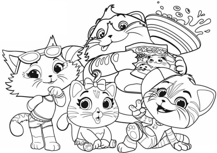 Kolorowanka przedstawia bohaterów bajki 44 Koty. Tworzą oni razem zespół muzyczny THE BUFFYCATS. Kotki te grają w garażu, który staje się miejscem spotkań również dla innych kotów. Razem przeżywają niesamowite przygody i pomagają sobie w trudnych momentach. To świetna bajka o przyjaźni. Użyj kolorów, które podpowiada Ci wyobraźnia i baw się dobrze!