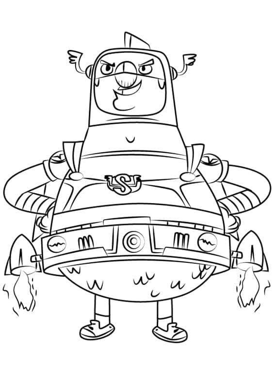 Przed tobą postać z bajki Atomic Puppet. Bohater ma na sobie szeroki pas, w którym są zamontowane dwa silniki odrzutowe. Dzięki temu może latać. Jest to śmieszna postać, która potrafi nieźle namieszać. Może masz ochotę pokolorować rysunek? Jeśli tak, bierz się do pracy. Użyj dowolnej metody, mogą to być kredki bądź farby.