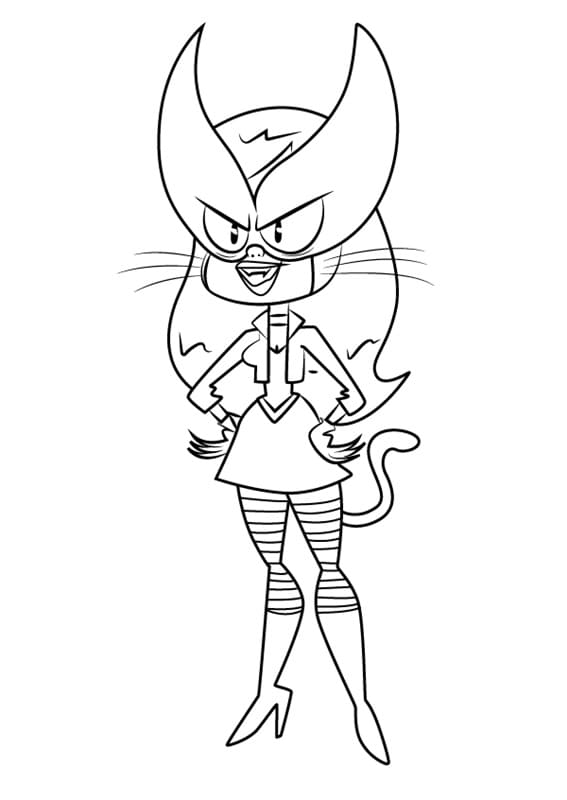 Ta oto postać z kreskówki Atomic Puppet przypomina nieco kobietę. Lecz ma bardzo dziwną maskę na oczach, a wąsy, ogon i pazury upodabniają ją do drapieżnego kota. Jak myślisz, czy to jest pozytywna postać, czy raczej negatywna? Jeśli oglądałeś choć raz bajkę z pewnością wiesz. A teraz pokoloruj obrazek najładniej jak potrafisz.