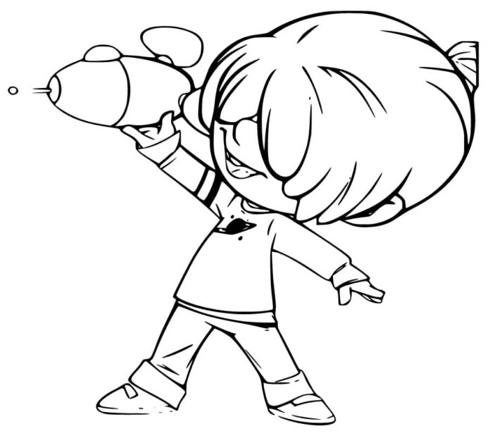 Na obrazku widzimy chłopca o bujnej fryzurze. W ręku trzyma rakietę. Pokoloruj bluzkę chłopca na niebiesko a spodnie zrób w kolorze brązowym. Resztę ubioru pokoloruj w wybranym przez siebie kolorze. Pamiętaj tylko aby nie wyjść kredką poza czarne linie, które są konturami rysunku.