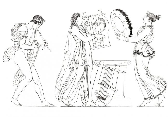 Ludzie od zawsze interesowali się światem muzyki. Pierwsze instrumenty muzyczne pojawiły się już 2000 lat przed naszą erą! Za najstarszy instrument na świecie uznaje się flet, który został odnaleziony w Niemczech. Jego wiek szacuje się na 35 tysięcy lat! Na obrazku widzimy grających Greków, a Twoje zadanie to pokolorowanie ich.