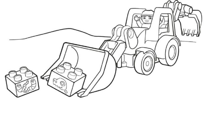 Klocki lego na obrazku mają na sobie naklejki. Po ile mają wypustek, po 4 czy 6? Widzimy jak w koparce siedzi ludzik lego w kasku. Myślę, że kask można pomalować na czerwono, a koparkę – na żółto. Klocki będą ciekawie wyglądały w zieleni i w kolorze niebieskim.