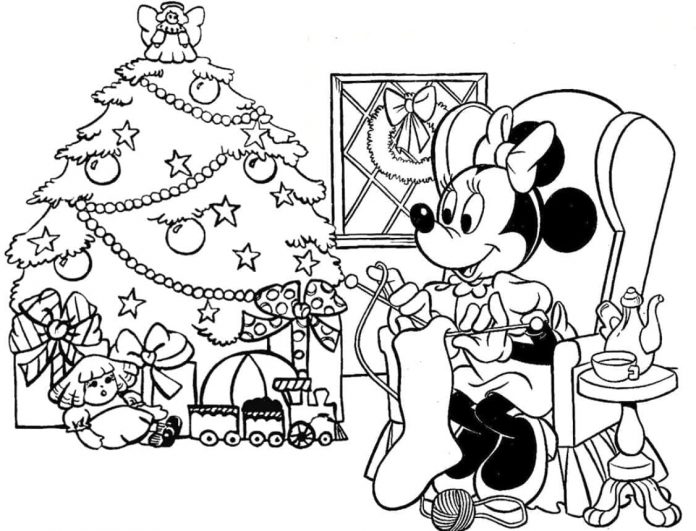 Kolorowankikolorowanki Disney Świąteczne – Boże NarodzenieMyszka Mini na fotelu przy choince świątecznej