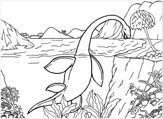 Czy wiesz że oprócz dinozaurów stąpających po ziemi były też takie które tylko żyły w wodzie i pływały w różnych jeziorach, bagnach, rzekach i oceanach? To dopiero były ogromne dinozaury! Spójrz tylko jakie on ma wielkie płetwy! Dzięki nimi mógł szybko i sprawnie pływać w wodzie. Pokoloruj tego dinozaura oraz jego piękne otoczenie na żywe i jasne kolory.