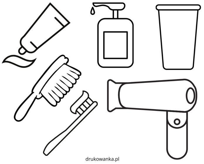 Jakie przedmioty widzisz na rysunku? Zgadza się jest o suszarka, szczotka do włosów, mydło w płynie, szczoteczka do zębów, kubek i pasta do zębów. Wiesz do czego służą te przedmioty? Wszystkie pomagają nam dbać codziennie o naszą higienę osobistą. Teraz pokoloruj przedmioty z rysunku.