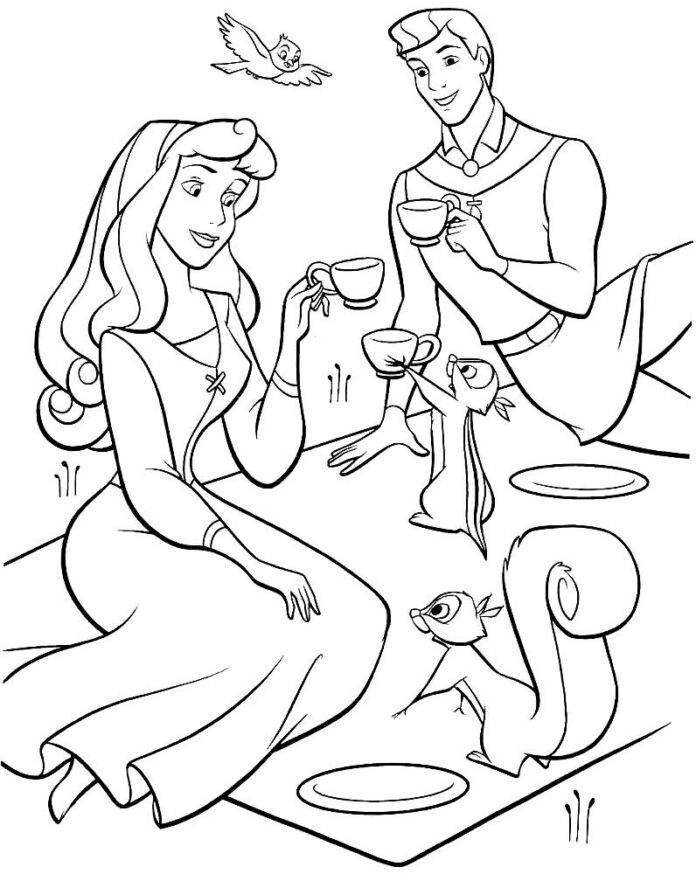 Nasza śpiąca królewna wraz ze swym ukochanym księciem wybrali się na piknik. Siedzą sobie wśród natury na kocyku i popijają zapewne herbatkę bądź kawę. Widzimy, że są z nimi także małe zwierzęta, które chyba też są chętne na napój z filiżanki. Pokoloruj bardzo starannie widoczny obrazek na swoje ulubione kolory.