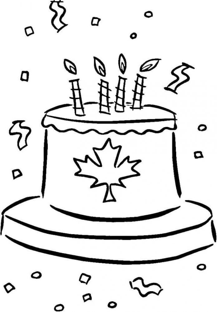 Obrazek przedstawia tort, na którym znajdują się cztery świeczki, a w okół niego lata konfetti. Kto ma właśnie urodziny! I chyba bardzo lubi Kanadę, ponieważ ponieważ torcie jest liść klonu, który bardzo kojarzy się z Kanadą. Jest również symbolem tego kraju, a liść klonu możemy zobaczyć także na fladze Kanady. Kolorując obrazek postaraj się nie wychodzić za linię.