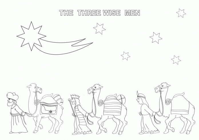 Trzej Królowie mieli do pokonania ogromną drogę aby dotrzeć do miejsca narodzin Jezusa. Prowadziła ich gwiazda betlejemska widoczna nad ich głowami. Każdy z Królów ma swojego wielbłąda, który niesie potrzebne rzeczy. Możliwe, że zwierzęta się zmęczyły i Królowie z nich zeszli aby było im lżej. Pokoloruj cały obrazek swoimi kredkami lub farbkami.
