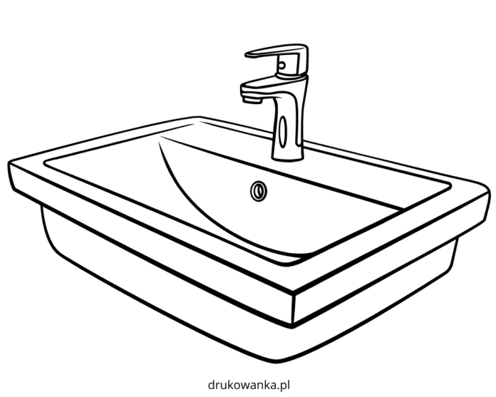 Na rysunku znajduje się prostokątna umywalka. Na jej górze umieszczony jest kran z którego można odkręcić zimną lub ciepłą wodę. W umywalce najczęściej myjemy ręce. Pamiętaj, aby robić to bardzo często i zawsze używaj do tego mydła. Pokoloruj umywalkę z obrazka. Możesz również dorysować mydło w płynie lub w kostce.