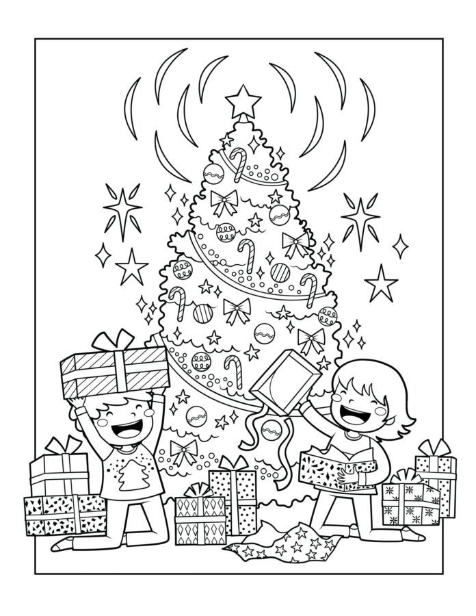 To jest chyba moment podczas świąt Bożego Narodzenia który dzieci lubią najbardziej i sprawia im to ogromną radość. Mowa tu oczywiście o dostawaniu prezentów. Jak widać dzieci na obrazku są bardzo szczęśliwe. Obrazkowi brakuje tylko kolorów, a więc weź swoje kredki i zacznij malować tak jak chcesz.