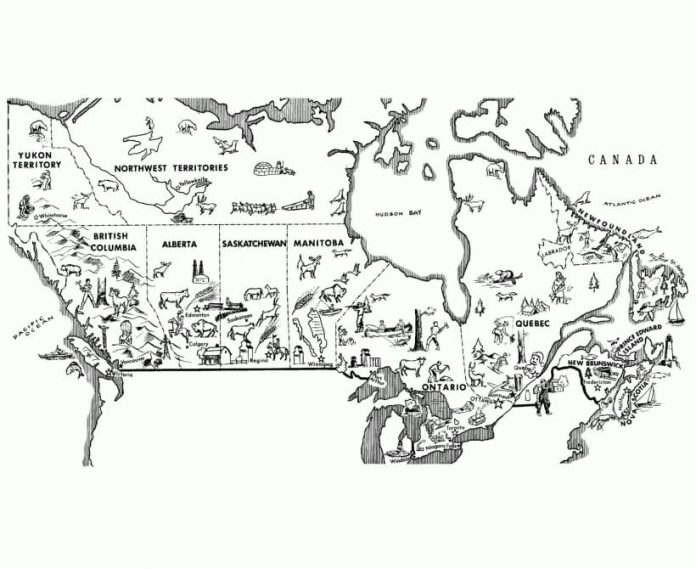 Mapka pokazuje jakie zwierzęta możemy spotkać w Kanadzie. Zachodnia Kanada jest idealnym miejscem do obserwacji dzikich zwierząt. Od małych świstaków po wilki i niedźwiedzie. W lasach i na łąkach pokrytych morzem kwiatów, można spotkać jelenie wapiti i sarny. Pokoloruj obrazek ulubionymi kredkami.